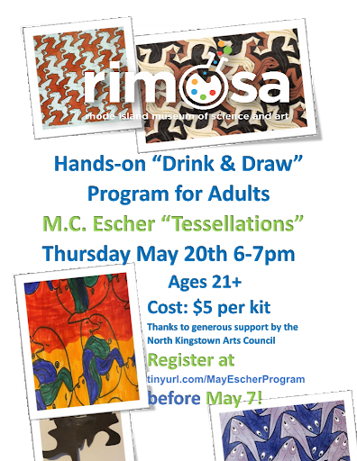 This hour-long program includes a brief discussion on the art of M.C. Escher – especially his tessellations (a type of art made by repeating shapes that cover the page like tiles). Then, the group will create their own tessellations using an easy technique lead by the RIMOSA Educator. No prior art experience or talent necessary! Visit tinyurl.com/MayEscherProgram to register. Please be sure to include an accurate home address and any specific delivery instructions, such as where to leave the kits or tips to locate your home if it is not easy to find.
